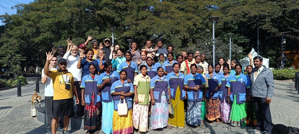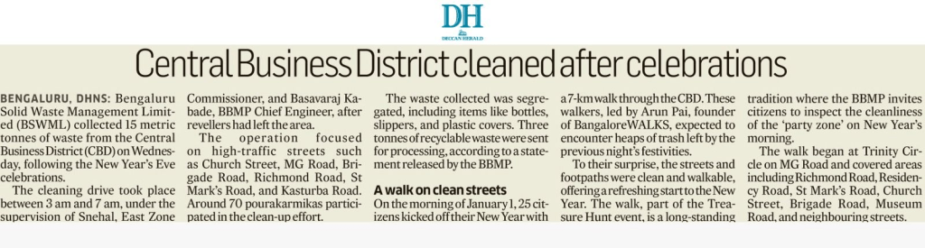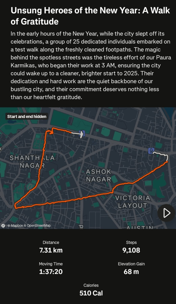 Unbelievable! 25 walkers started 2025 at 7am on Jan 1 morning by walking 7km in Blr’s CBD (New Year Party Central) on a TRASHure Hunt! We expected to see mounds of trash from the massive street party that ended a few hours earlier – and we were stunned. The streets were clean, the footpaths were walkable and it was impossible to believe that the place had been a wild, party zone a few hours earlier.